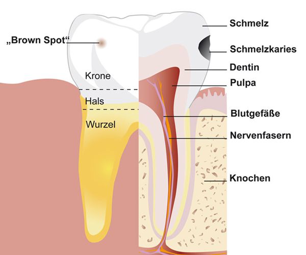 Die harte Zahnsubstanz besteht im Bereich der Zahnkrone (dem im Mund sichtbaren Teil des Zahnes) aus zwei Schichten: dem Zahnschmelz und dem darunter liegenden Zahnbein (Dentin).